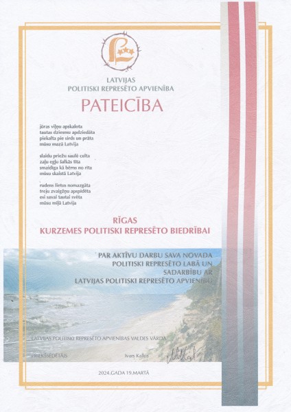 Noliekot apvienības vadītāja pilnvaras, vēlos pateikties ikvienam, kurš sniedza man atbalstu un padomu, pateicos apvienības valdes locekļiem, nodaļu vadītājiem par ieguldīto darbu represēto personu labā. Paldies partijām, kuras izrāda rūpes par mums. Pateicos par konstruktīvo sadarbību Okupācijas muzejam, Latvijas Okupācijas izpētas biedrībai, Likteņdārza padomei, Kara muzejam, Tieslietu ministrijai.